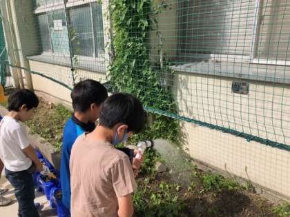また、飼育・栽培委員会の児童も、発芽した植物に水やりをしています。