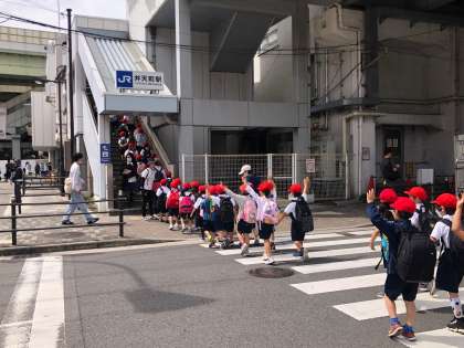 子どもたちは学校から駅までの道をきちんと整列して、安全にホームに向かいました。