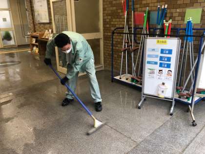 子どもたちが滑ってけがをしてしまわないように、校舎内にできる水たまりを整備しています。
