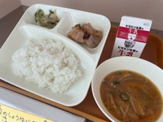 6月7日(水)、今日の給食は「鶏肉のしょうゆバター焼き・みそ汁・野菜いため・ごはん・牛乳」です。