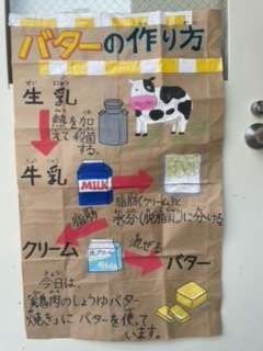 鶏肉のしょうゆバター焼きは、鶏肉に料理酒、こいくちしょうゆで下味をつけ、湯せんでとかしたバターをかけてからオーブンで焼いています。バターでまろやかな味になって、子どもたちにも好評でした。