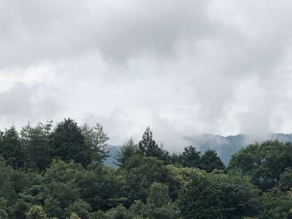 道の駅 まほろば に着きました。 山には、雨露をふくむ煙霧がかかっています。