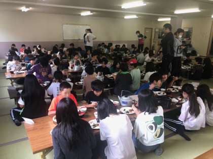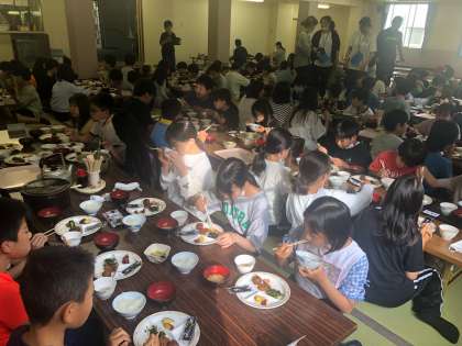 朝食の時間です。 食事係がすばやく準備を済ませて、みんなで美味しくいただきました。