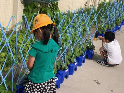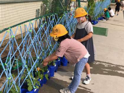 1年生が大切に育てているアサガオが、ぐんぐんと育ってきています。