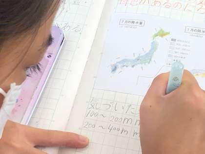 社会科では、「日本の気候にはどのような特色があるのだろう?」という学習をしています。7月と1月の降水量の違いを比較するために、白地図に色を付けて考えました。