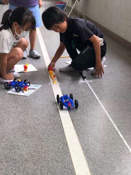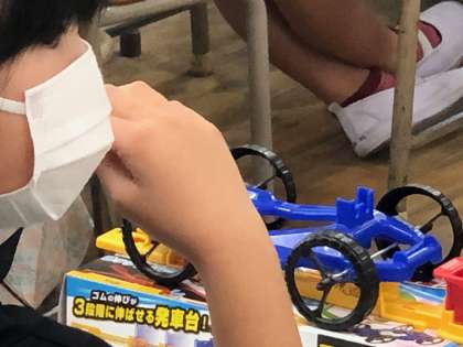 ゴムを引っぱったりねじったりすると、もとにもどろうとする力が働くことを利用して、ゴムの力でものを動かす実験をしました。