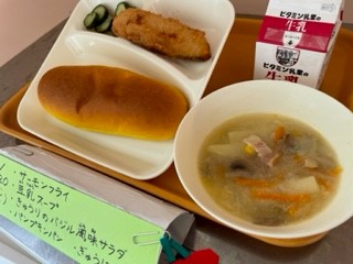 6月20日(月)、今日の給食は「サーモンフライ・豆乳スープ・きゅうりのバジル風味サラダ・パンプキンパン・牛乳」です。
