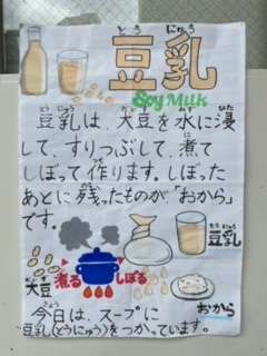 今日の豆乳スープは、ベーコン、じゃがいも・たまねぎ・にんじん、コーン、パセリ、マッシュルームなど、たくさんの具材を使って彩りよく仕上げています。ベーコンをからいりして、うま味を引き出しています。