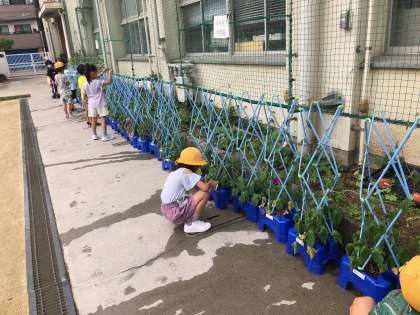 「わたしの背よりも高いよ」「つるが隣の鉢までのびそうだよ」と、子どもたちも口々に話をしています。