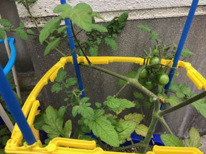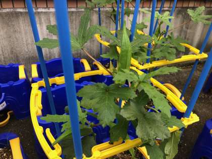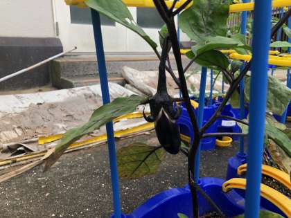 左から、ナス、ミニトマト、オクラです。上の写真は、キュウリです。