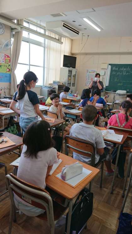 いつものように会話を楽しむ中で、自分の思いや考えを英語で伝える活動をしています。