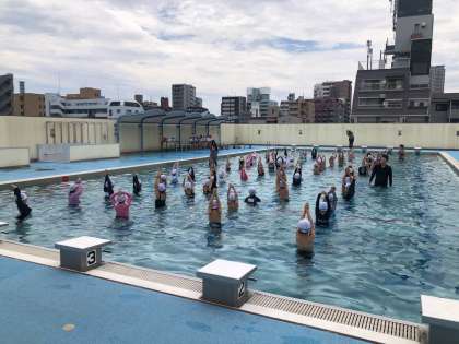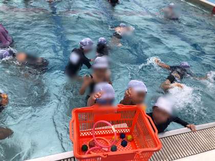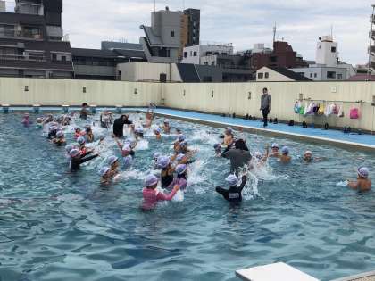 2年生のプール水泳では、3年生以降の水泳学習につなげるために、いろんな水遊び、水慣れに取り組んでいます。