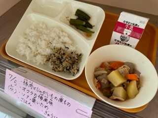 7月5日(水)、今日の給食は「豚肉とじゃがいもの煮もの・オクラの梅風味・ツナっ葉いため・ごはん・牛乳」です。