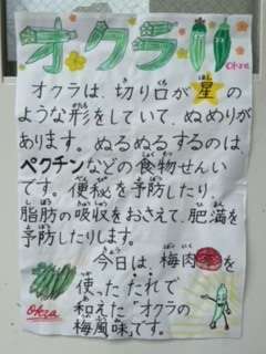 今日は、旬のオクラを梅肉の入った調味液で和えた「オクラの梅風味」でした。梅肉でさっぱりと食べることができました。