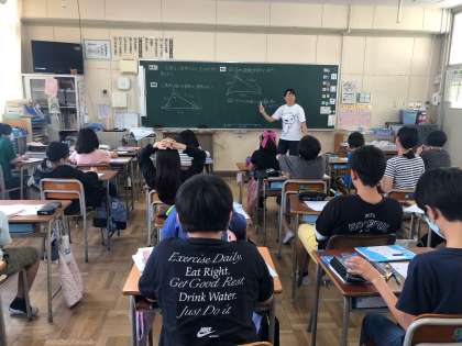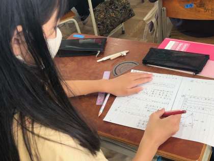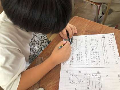 定規や分度器、コンパスを使って図形を描いたり、角度を求めたりしています。