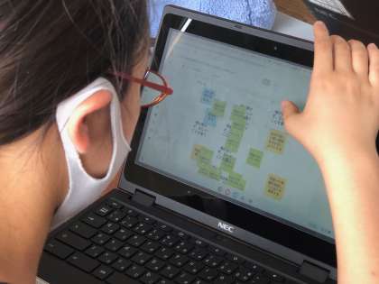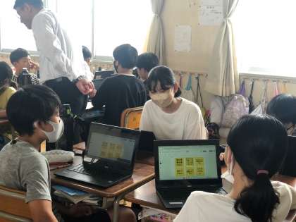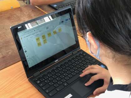 情報を発信するときに気をつけることについて、一人一台端末に一人一人が打ち込み、グループのみんなで考えを共有して話し合いました。