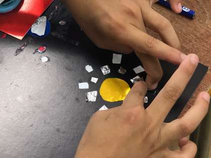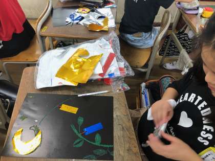 7月7日 4年 図工 公開日 2023/07/07 更新日 2023/07/07 お知らせ 図工は、キラキラワールドを制作しています。 キラキラの色紙を好きな模様に切って、黒の台紙に貼っていきます。 材料には、いろんな形の部品もたくさん入っているので、子どもたちにとっては仕上がりのイメージも広がって、楽しく制作しています。 いいね(0)