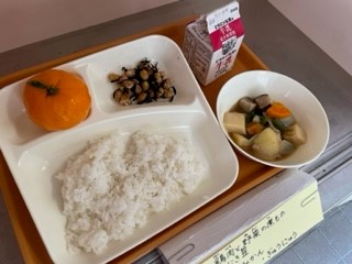 7月10日(月)、今日の給食は「鶏肉と野菜の煮もの・ひじき豆・冷凍みかん・ごはん・牛乳」です。