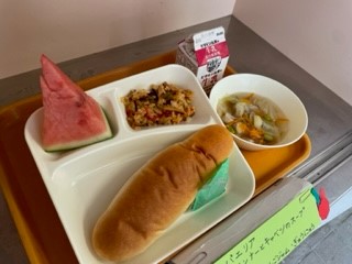 7月11日(火)、今日の給食は「パエリア・ウインナーとキャベツのスープ・すいか・コッペパン・りんごジャム・牛乳」です。