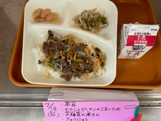 7月12日(水)、今日の給食は「牛丼・もやしとピーマンのごまいため・大福豆(おおふくまめ)の煮もの・牛乳」です。