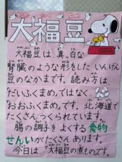 今日はオーブンで煮た「大福豆の煮もの」が登場しました。不足しがちな食物せんいがとれるように、給食ではいろいろな豆類が登場します。大福豆は、甘納豆、煮豆、和菓子などに使われる豆です。甘い味つけで、やわらかに煮えていました。