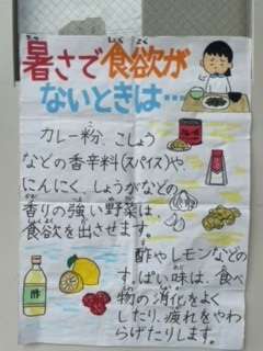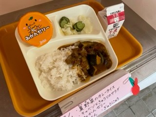 今日は、かぼちゃ、なす、ピーマン、トマト(缶)などの夏野菜を使った「夏野菜のカレーライス」でした。夏野菜を苦手とする児童は少なくないのですが、カレーライスなので苦手な野菜も食べることができていました。ご家庭でも旬の夏野菜を使ったカレーライスをぜひ試してみてください。