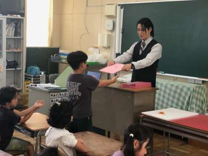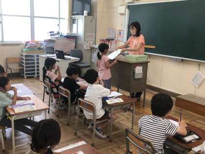 1年生、2年生の教室では、通知票を一人一人に渡していました。