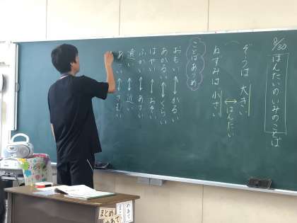 子どもたちは、自分の知っている言葉から、反対の意味の言葉を見つけて発表していました。子どもたち、とてもよく知っています!