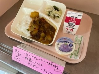 8月30日(水)、今日の給食は「ビーフカレーライス【米粉】・野菜のピクルス・ぶどうゼリー・牛乳」です。