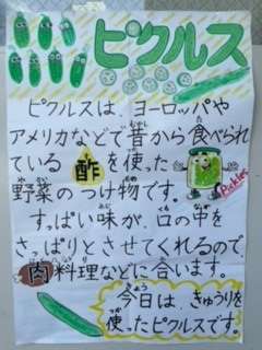 給食はすべて加熱調理しています。今日の「きゅうりのピクルス」も、きゅうりをゆでてから、砂糖や塩、ワインビネガー、うすくちしょうゆなどで作った調味液につけています。