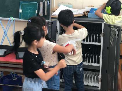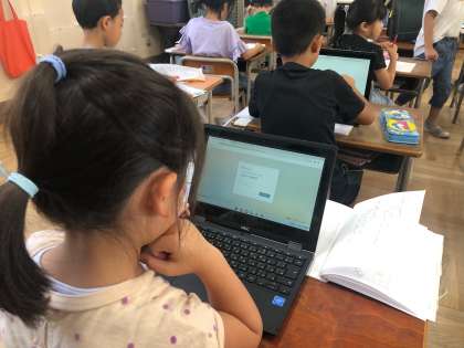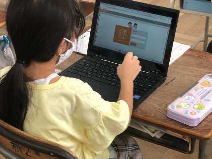 1年生の朝の教室です。 子どもたちは、一人一台端末を開き、心の天気を入力しています。