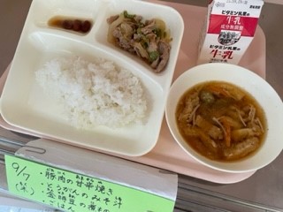 9月7日(木)、今日の給食は「豚肉の甘辛焼き・とうがんのみそ汁・金時豆の煮もの・ごはん・牛乳」です。