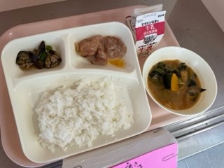 9月14日(木)、今日の給食は「鶏肉のてり焼き・かぼちゃのみそ汁・なすのそぼろいため・ごはん・牛乳」です。