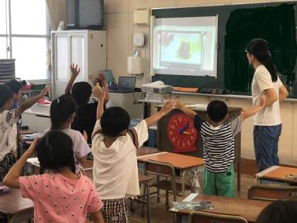 1年生はからだ全体を使って楽しく英語に親しんでいました。