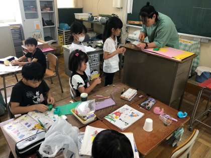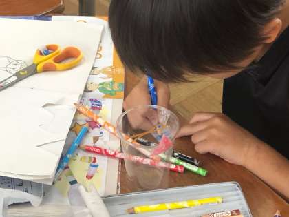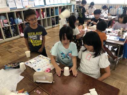 みんなで工夫しておもちゃを作りました。試作したおもちゃを試しに動かして、完成度を高めています。子どもたちはみんな発明家でした。