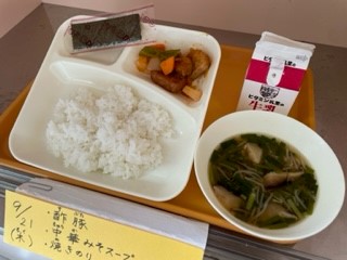 9月21日(木)、今日の給食は「酢豚・中華みそスープ・焼きのり・ごはん・牛乳」です。