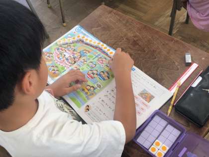 教科書のさし絵を見ながら、「5人の3つ分」「2人の3つ分」等の数の表し方を学び、かけ算の学習に関心を持てるようにしています。