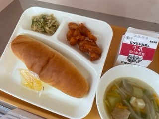 9月25日(月)、今日の給食は「ヤンニョムチキン・とうふのスープ・切干しだいこんのナムル・ごはん・牛乳」です。
