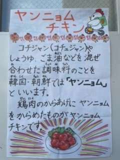 今日は、韓国・朝鮮料理の「ヤンニョムチキン」が登場しました。今日は、鶏のからあげにケチャップやコチジャン・こいくちしょうゆなどで作ったヤンニョムをからませています。甘めの味付けで子どもたちにも人気でした。