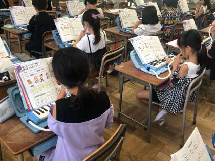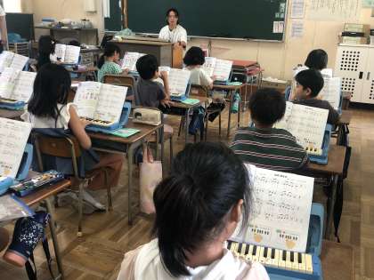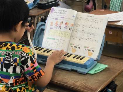 2年生の音楽は、♪山のポルカ♩の曲を、鍵盤ハーモニカで奏でる学習です。音色がよくなってきました。