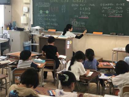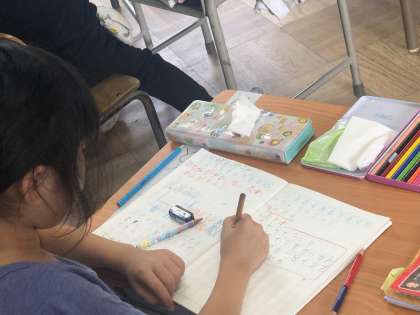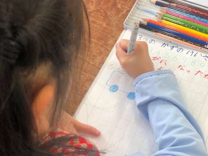 5+3+2 では、 はじめに 5+3 の計算をしてから、 8+2 の計算をします。今日は数の概念の定着を図るために、子どもたちにノートにバスやうさぎの絵を描かせました。
