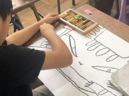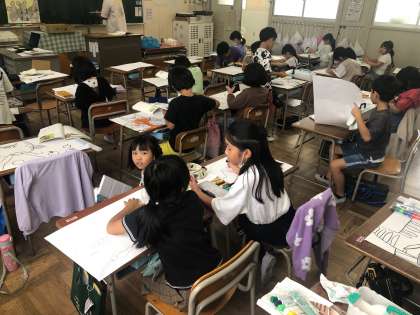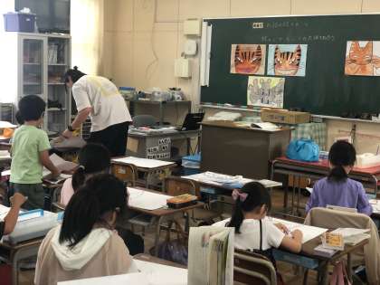 2年生の今日の図工では、国語で学習した「ニャーゴ」で登場するねこやねずみの絵を描いています。みんな画用紙いっぱいに大きく描けています。上手です。