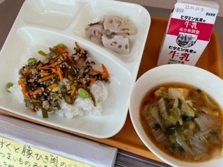 10月6日(金)、今日の給食は「もずくと豚ひき肉のジューシー・さつまいものみそ汁・焼きれんこん・牛乳」です。