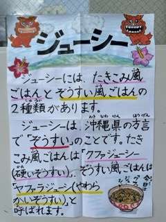ジューシーは、沖縄県の料理で炊き込みご飯と雑炊とがあります。今日の給食では炊き込みご飯風のジューシーが登場しました。豚ひき肉、切りこんぶ、もずく、にんじんなどを使って、豚骨スープでうま味を増した具をご飯と混ぜていただきます。