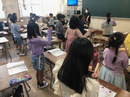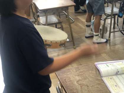 2年生は、音楽で「2拍子を感じながらリズムを打ちましょう」を学習しています。2拍子にのって、タンバリンやウッドブロックを打ちました。