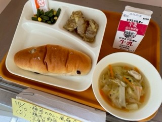 10月10日(火)、今日の給食は「豚肉のカレー風味焼き・鶏肉と野菜のスープ・三度豆とコーンのサラダ【ノンエッグドレッシング】・レーズンパン・牛乳」です。