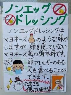 今日は「三度豆とコーンのサラダ」に、ひとり1袋の「ノンエッグドレッシング」をかけていただきました。ノンエッグドレッシングは、卵不使用のマヨネーズ風味の調味料です。卵使用のマヨネーズよりもさっぱりとした味わいです。