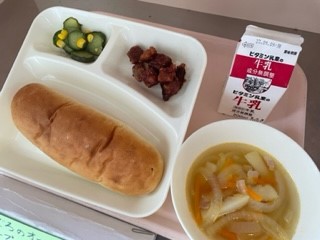 10月12日(木)、今日の給食は「まぐろのオーロラ煮・スープ・きゅうりとコーンのサラダ・おさつパン・牛乳」です。