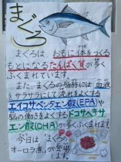 まぐろのオーロラ煮は、子どもたちにとても人気のある献立です。しょうが汁で下味をつけたまぐろ(角切り)に片栗粉をまぶして油で揚げて、ケチャップ、砂糖、赤みそで作ったたれをからませています。