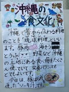 「ソーキ汁」は、豚の骨付きばら肉(スペアリブ)をやわらかく煮込んですまし仕立てにした汁物のことです。給食では、豚ばら肉、だいこん、切りこんぶなどを使っています。